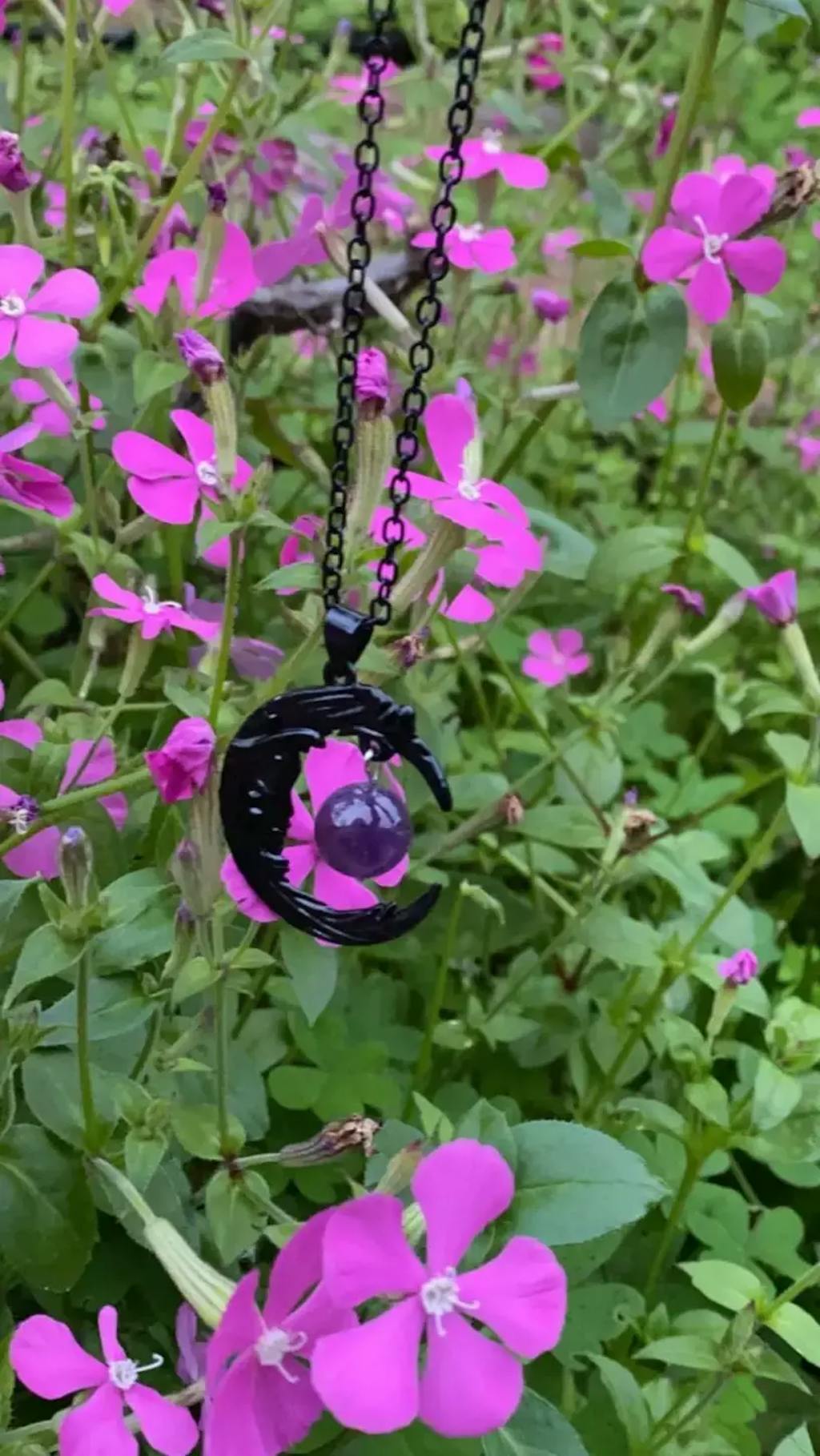 Necklace: The necklace features a jet-black crescent moon, intricately carved with the serene face of the Goddess. Suspended beneath is a glowing amethyst sphere, symbolizing spiritual clarity and intuition. This talisman draws upon the moon's energies, offering protection, insight, and a connection to the divine feminine.