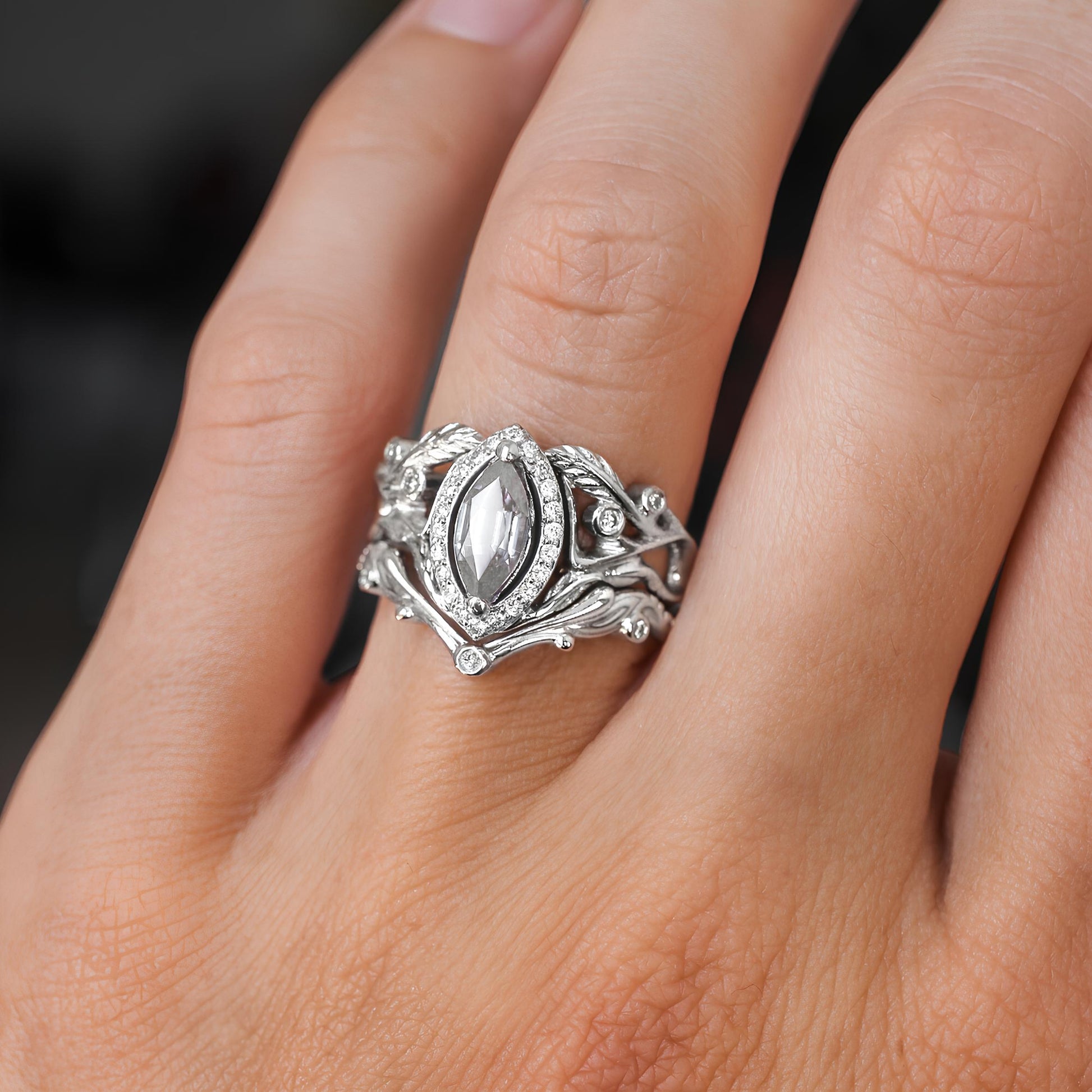 The Arcane Grove Enchantress Ring is a sacred adornment crafted for witches who walk between the realms of earth and spirit. Its marquise-cut crystal glimmers like a hidden moonbeam filtering through enchanted trees, while the woven vinework encircling it represents the ancient paths of nature, intuition, and spellcraft.