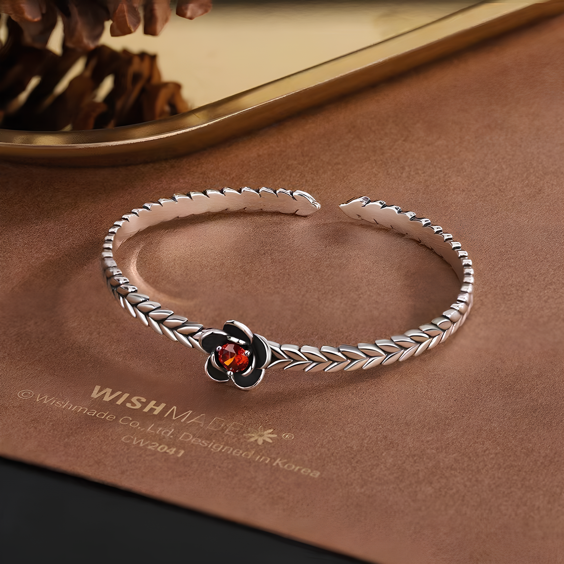 The Blossomfire Woven Cuff is a fierce yet elegant talisman, blooming with elemental strength and feminine resilience. At the heart of this bracelet lies a crimson crystal cradled by a blooming rose—set upon a band carved in woven leafwork that channels the sacred cycle of growth, decay, and rebirth.