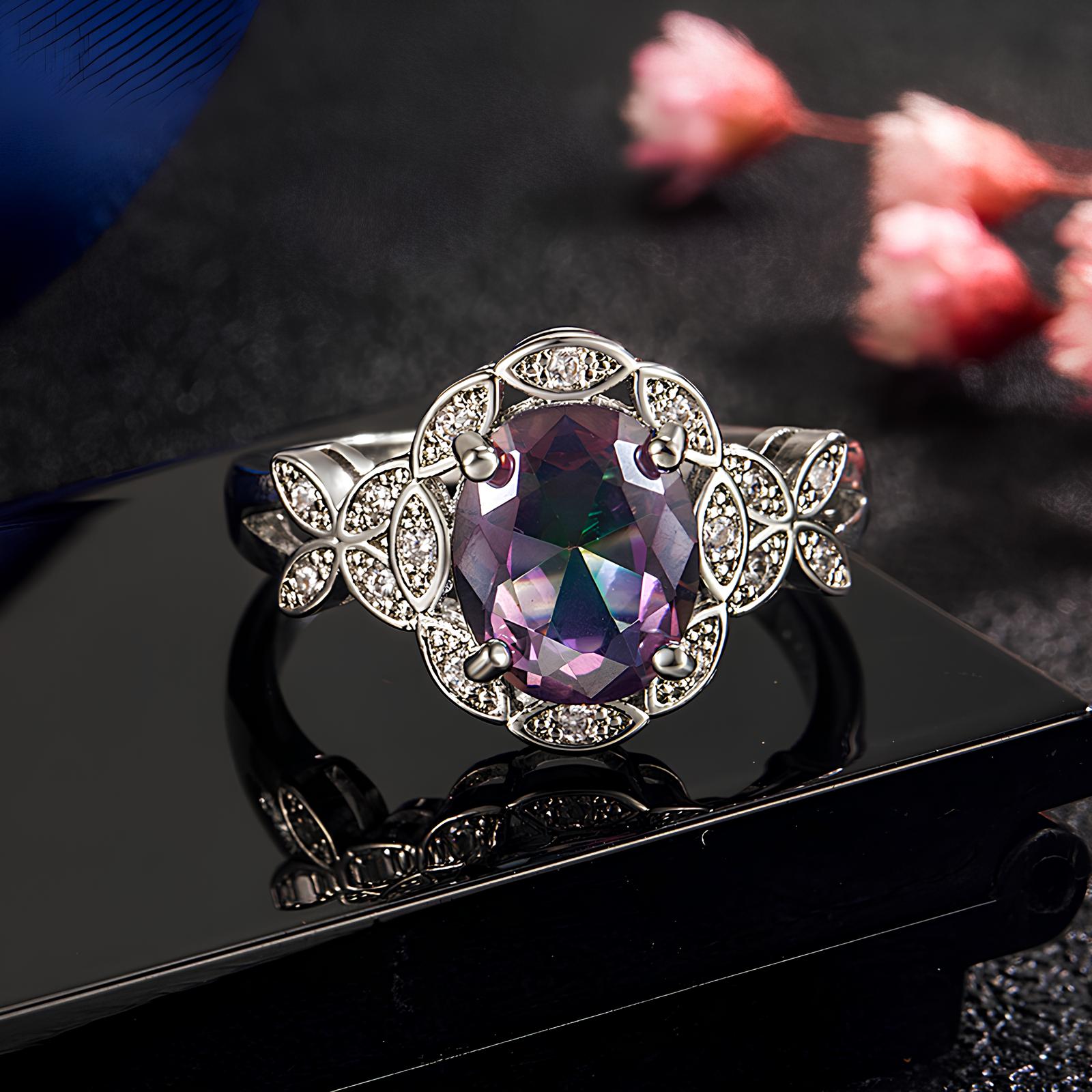 The Divine Aura Blossom Ring is a shimmering emblem of spiritual awakening and ethereal beauty. Its prismatic aura crystal radiates shifting rainbow light, surrounded by a blooming floral halo that symbolizes growth, inner harmony, and the unfolding of your magickal potential.