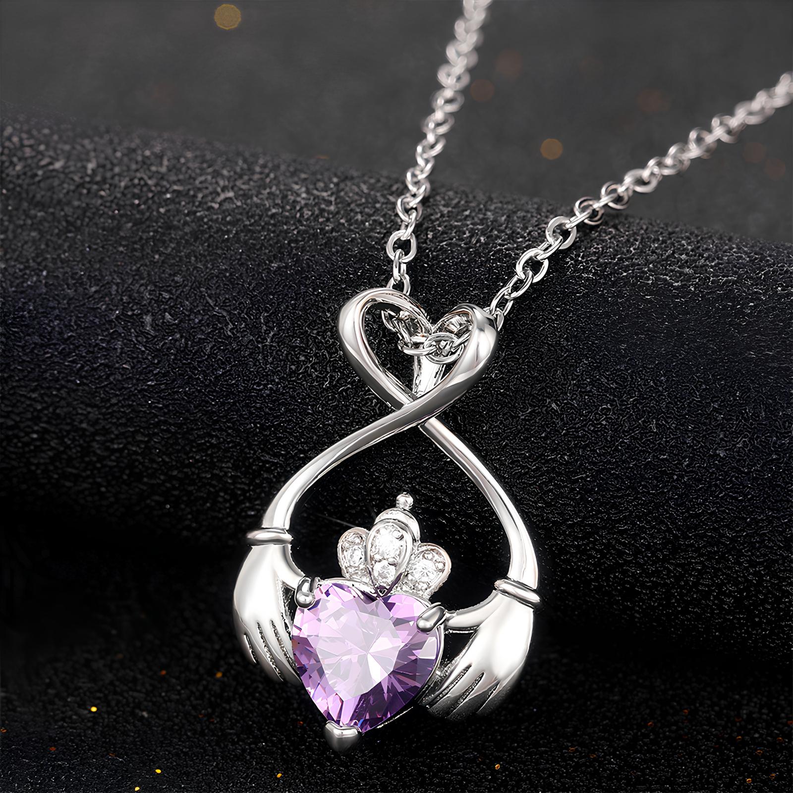 Let your heart be held in eternal devotion with the Embrace of Love Crowned Necklace. Inspired by sacred union and royal loyalty, this design weaves together the timeless elements of a crowned heart, gently cradled by open hands, and crowned with an infinity symbol to represent never-ending affection and trust. A radiant violet heart crystal pulses with mystical charm, drawing in energies of divine love and spiritual protection.