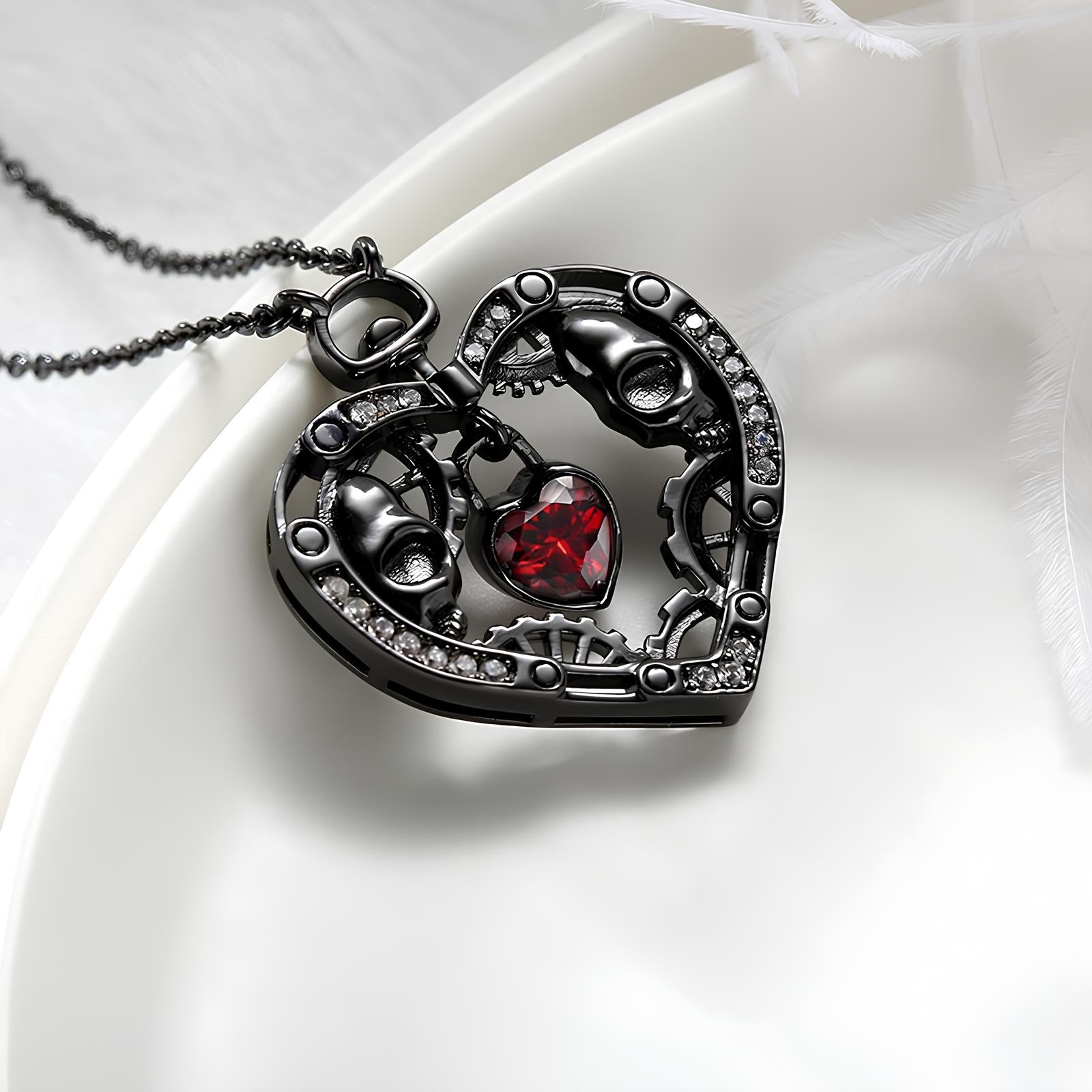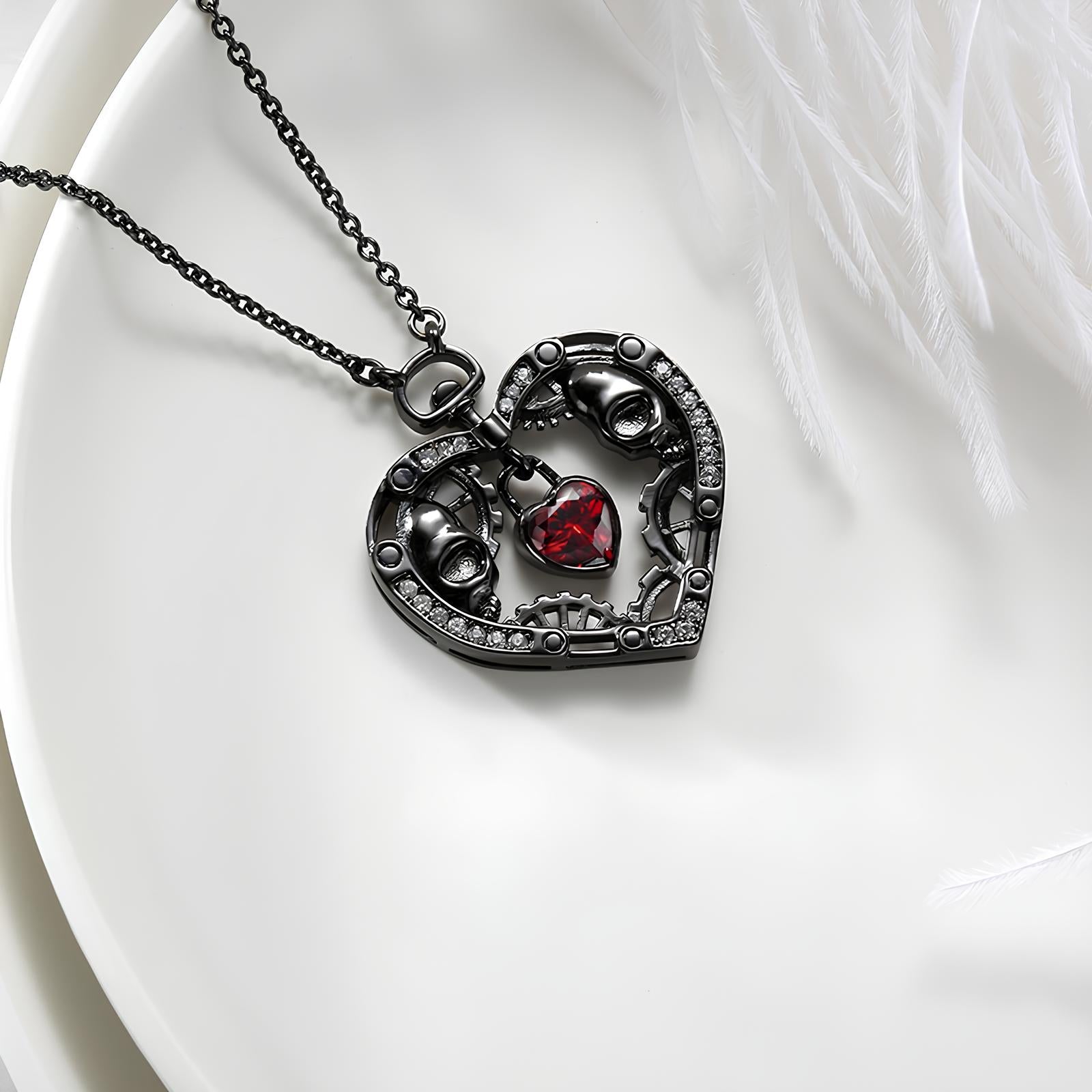Two entwined skulls meet at the heart of this darkly romantic talisman, surrounded by intricate clockwork gears and a crimson heart crystal that pulses with passion. This necklace is a testament to the eternal dance between love and mortality — a steampunk-inspired symbol of bonds that endure beyond time itself.