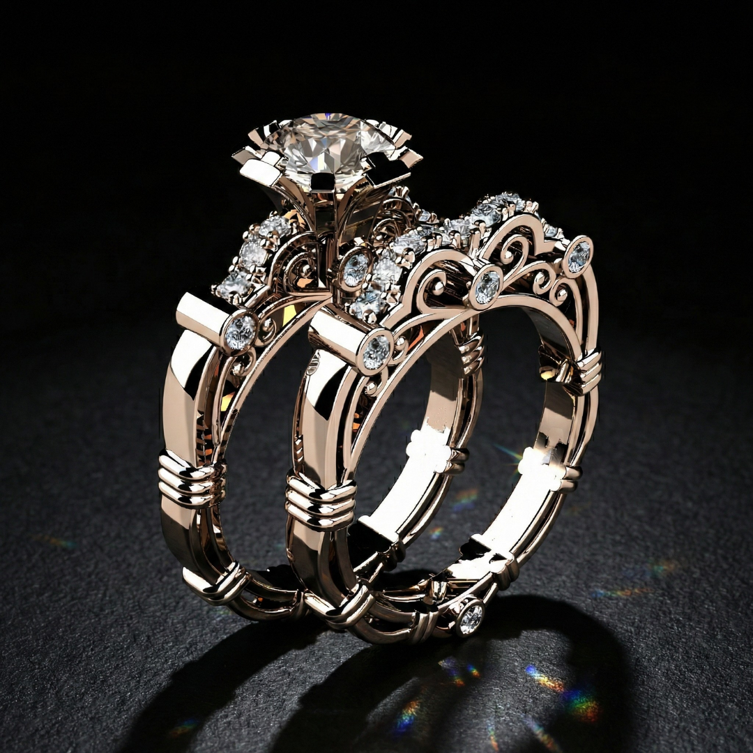 One ring is crowned with a raised central crystal, drawing the eye upward and symbolizing leadership, commitment, and honor. The accompanying band echoes the same intricate patterns and accent crystals, creating harmony between the two pieces. Together, they form a bond that feels ceremonial, meaningful, and enduring.