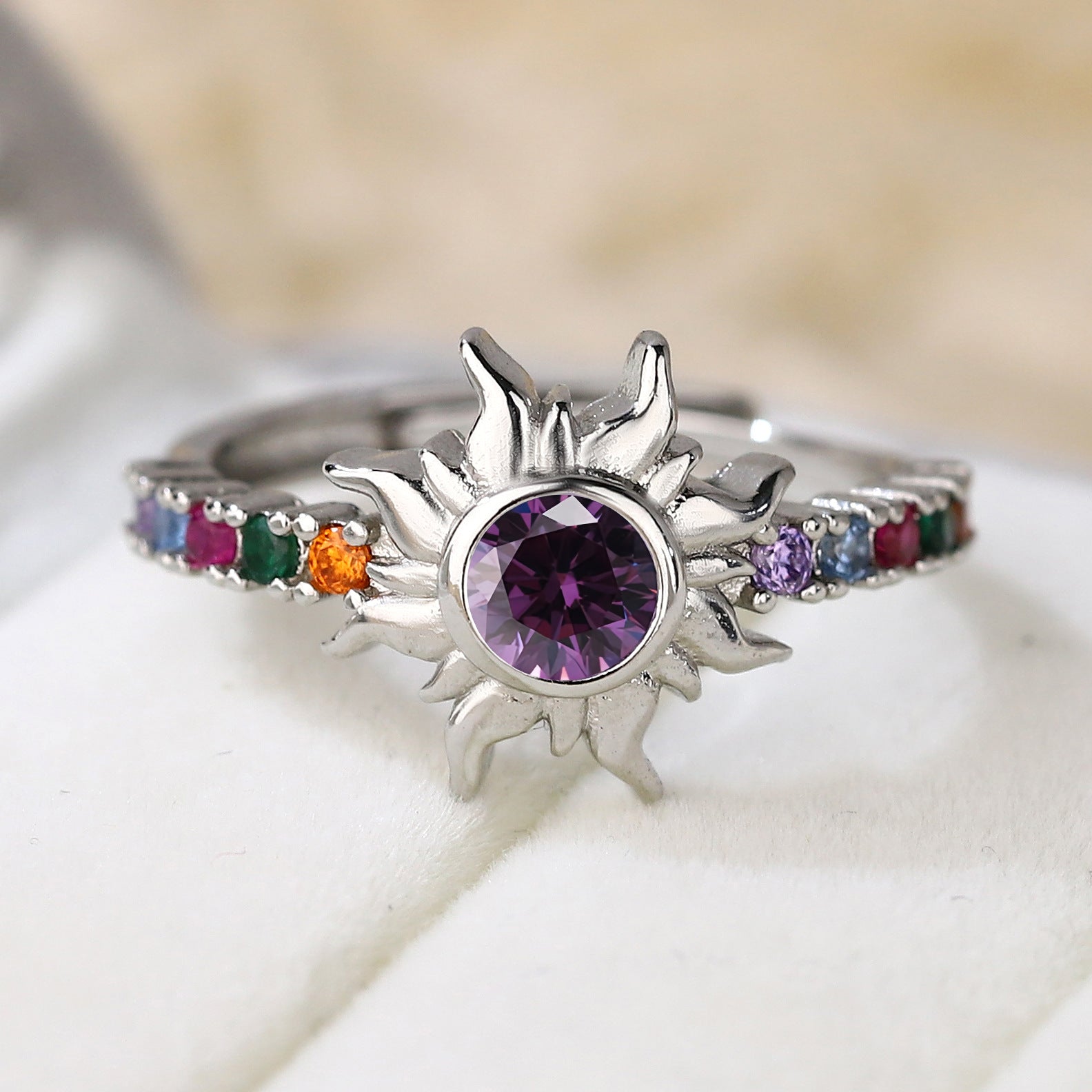 Along the band, a trail of multicolored accent stones adds depth and harmony, reflecting the balance of energies that flow through the sun’s path. The design feels bold yet refined — a celebration of illumination, confidence, and spiritual clarity.