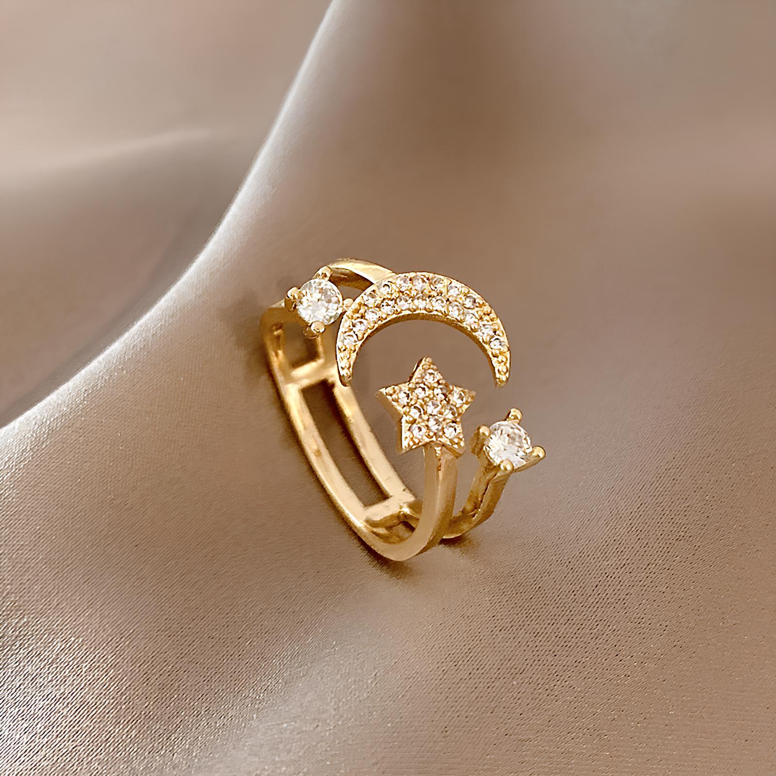This enchanting gold-tone ring features a crescent moon and star duo, both encrusted with shimmering crystals that catch the light like falling stardust. Balanced by two luminous orbs, it serves as a symbol of spiritual alignment, cosmic guidance, and the harmony of inner and outer realms.
