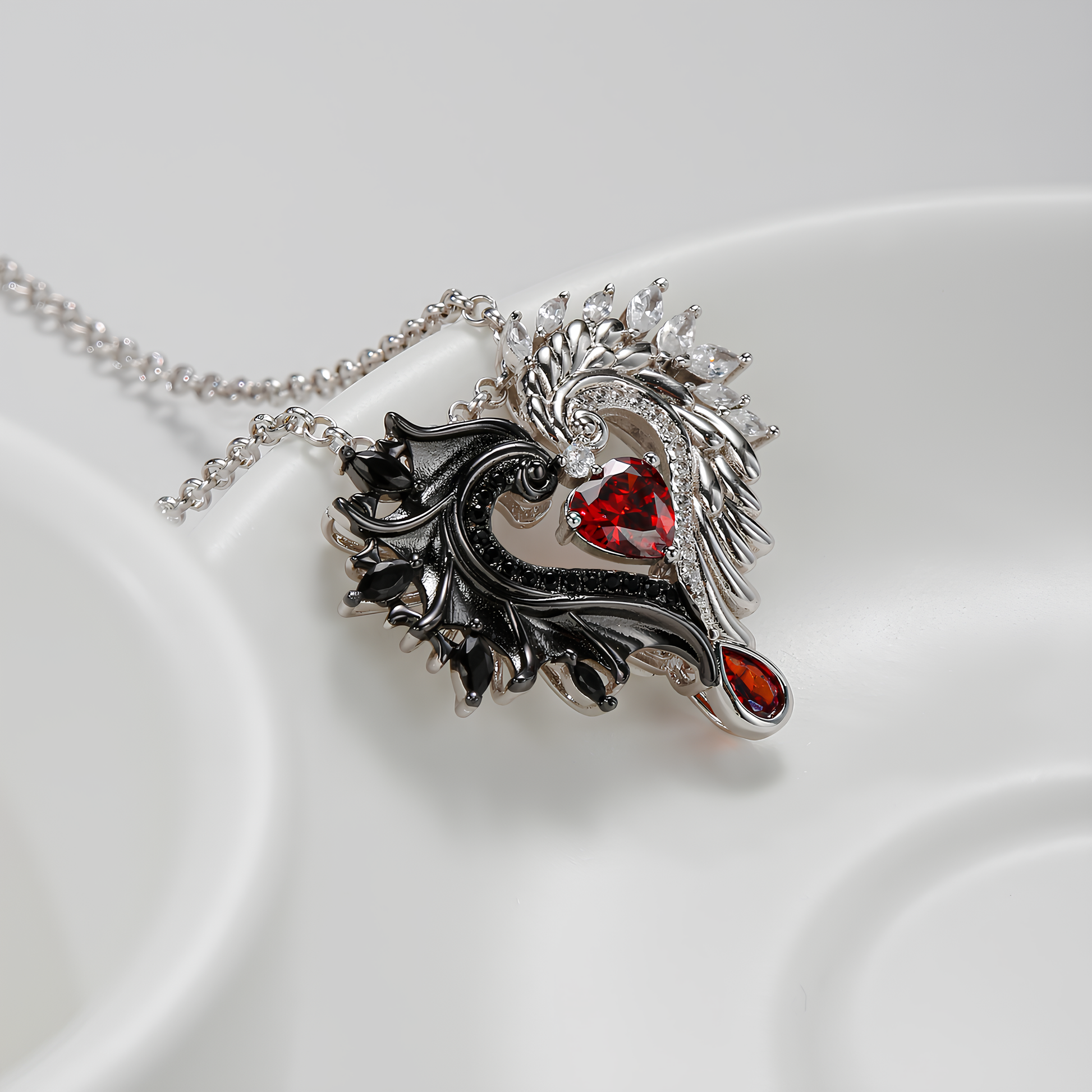 The Wings of Light and Shadow Love Necklace features an intricately sculpted heart embraced by contrasting wings—one angelic and luminous, the other dark and fierce. At its core glows a fiery heart-shaped crystal, symbolizing a love that transcends all boundaries—of light and shadow, joy and sorrow, spirit and flesh.